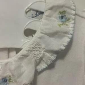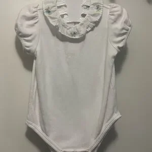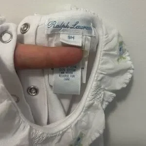 Charming white baby onesie by Ralph Lauren. Features delicate floral accents. Ideal for any occasion.