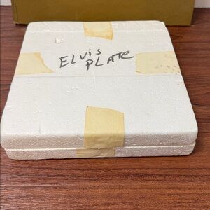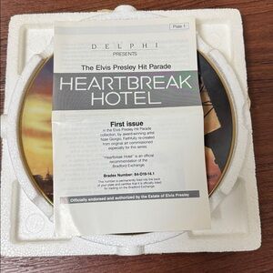 • The plate depicts Elvis Presley with a sign for the "Heartbreak Hotel" in the background.
