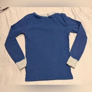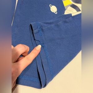 Blue pajama top with glow in the dark astronaut print. Striped pants with space theme. Cozy and fun for bedtime. Play condition due to one slight discoloration (maybe from bleach?) on the left arm (see picture) and bottom seam of astronaut pj top unraveling (see picture) and usual wear from use.