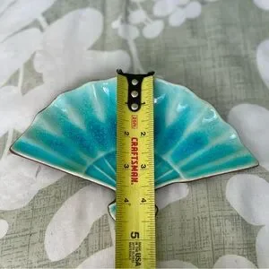Vintage Teal Glass Ceramic Oriental Fan Dish Decorative Home Accent