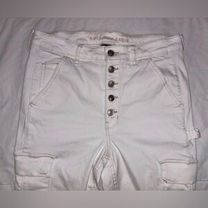 American Eagle Outfitters Next Level Super Hi-Rise Cargo Jegging — size 12 Short. Very good pre-owned condition: no major flaws, just one very faint spot on the right back area, as shown in photos. The mark has been washed and is hardly noticeable when worn.