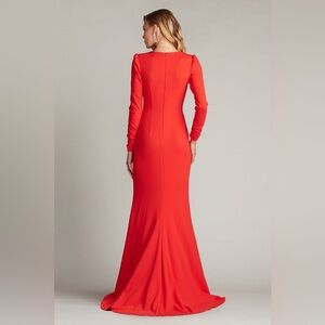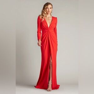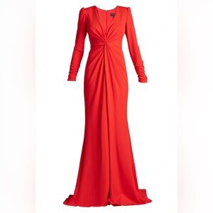 This elegant gown features a deep V-neckline and long sleeves exuding modern sophistication. Crafted from crepe fabric it offers a sleek silhouette with a twist knot front detail that adds subtle texture and accentuates the waist. Concealed back zip.