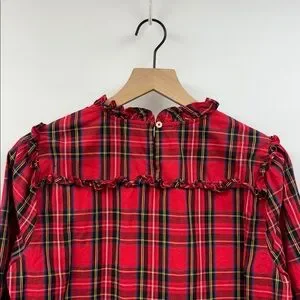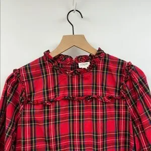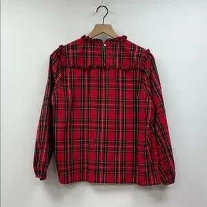 J. Crew Tartan Plaid Ruffle Popover Poplin Blouse Preppy Holiday Red Medium