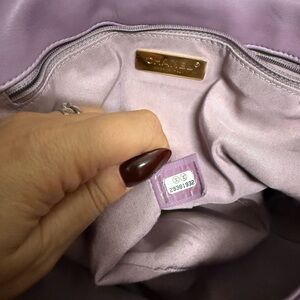 Chanel shoulder bag in lavender with quilted design. Features gold chain accents and iconic logo.