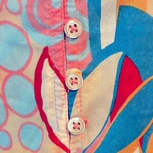 Perfect summer top from Talbots! Great with white shorts or jean skirt! Has slight ruffle around the neck with tiny buttons down the chest. Has a straight hem and hits at the hip. Made from 100% cotton. Length measures 26 inches. Armpit to armpit measures 18 inches. Shoulder to shoulder measures 12. Good preowned condition.
