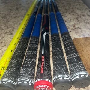 Set of golf clubs with Golf Pride Control Core grips. Features black, blue, and red colors.