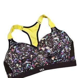 Color Multicolor, Splatter Paint Print, Size 32b, Nylon Material, Licra Material, Polyester Material, Support, Activewear, Racerback, Pullover, Hook And Eye Clousure, High Support, Underwired, Thick Adjustable Straps, Comfortable, Gently Wear, Great Condition.