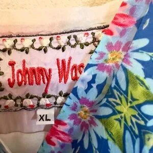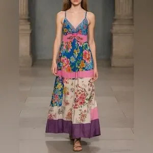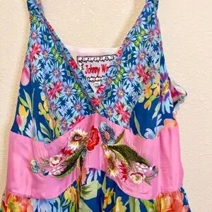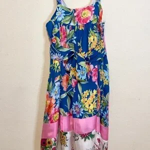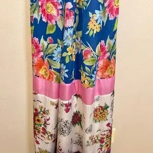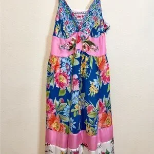 Johnny Was Colorful floral maxi dress with a mix of blue and pink. Features a flattering silhouette and elegant design. Embroidered at waist. V-neck with straps. 1/2 of skirt lined. 100% cotton