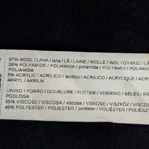 Material: Shell: 67% Wool/28% Polymide/5% Acrylic; Lining: 55% Viscose/45% Polyester