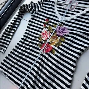 Johnny Was Black and White Striped Floral Embroidered Top