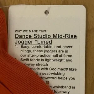 Brand new with tags. Never been worn. Lululemon Dance Studio Mid-Rise Jogger, Lined in SNOR/ Sunburst Orange.