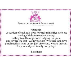 Please note: Beauty for Ashes Boutique® and Beauty for Ashes® carries t-shirts, worship flags, clothing, jewelry and accessories; many with our trademark brand name 'Beauty for Ashes' - which means God will restore Beauty in place of life's ashes - Isaiah 61:3. None of our items carry literal ashes. Instead, our items carry the blessings of God representing restoration and divine destiny for each individual