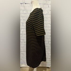 This stylish Ann Taylor Loft dress is perfect for any fashionable woman. The black and brown stripes give it a chic look that is sure to turn heads. Made of a durable and comfortable blend of polyester and spandex, it is perfect for any occasion. The dress has a short sleeve and zip closure, making it easy to put on and take off. With a knee-length hem, it is appropriate for both formal and casual events. The sheath style flatters the figure, while the size medium fits regular women. Size medium and 19 inches pit to pit and 35 inches long. Smoke free home.