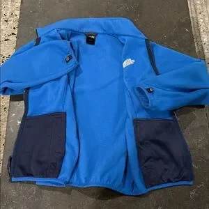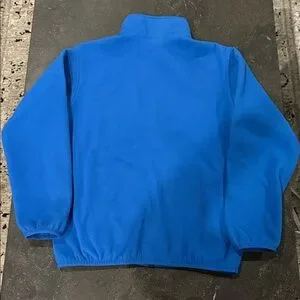 The North Face blue fleece jacket with full-zip design. Boys Large (14-16). Great for a girl or small adult too-see measurement photos. Ideal for outdoor wear. Features The North Face logo, two front pockets, elastic at wrists and waist. Excellent condition.