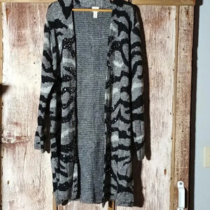 Chico's Jovi long line cardigan camo animal gray sequins wool mohair blend XL