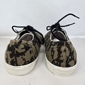 Elevate your casual style with these Gram sneakers in tan-green and black. The blended fabric upper features a geometric print and round toe shape, with lace-up closure for a secure fit. The rubber outsole provides traction and durability, making them suitable for travel and everyday wear.