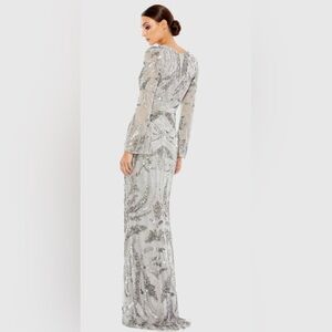 The NWT MAC DUGGAL size 20 Platinum gown is a stunning sheath dress with a V-neckline and long sleeves, featuring intricate hand embellishments on a mesh overlay. Made of polyester, this long dress has a zipper closure at the back, making it both stylish and elegant for any special occasion. Front split and split sleeves. SMOKE FREE ENVIRONMENT! MSRP $598