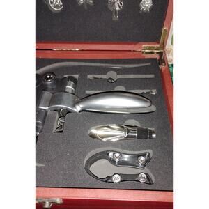 This handsome wine accessory set comes in a lacquered wooden presentation case and includes a full collection of tools plus a display of decorative silver-tone wine glass charms. Perfect for entertaining, gifting, or adding a classy upgrade to a home bar.