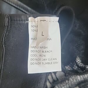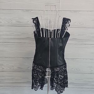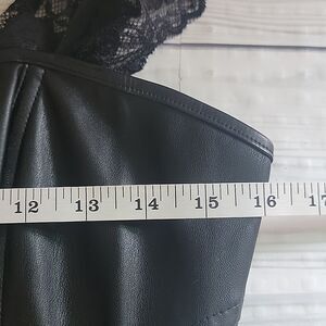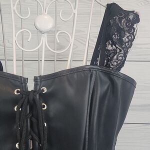 Black faux leather corset top with lace trim and accents and a full zipper back closure for ease. Like new condition.
