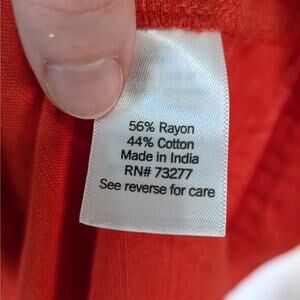 LC Lauren Conrad peasant top in a vibrant red-orange color with soft, feminine details. Made from a breathable rayon and cotton blend, this top features a wide elastic neckline and scalloped flutter sleeves for a relaxed, boho-inspired look.