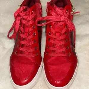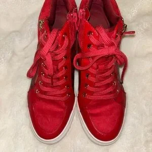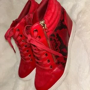 Bold red sneakers with a stylish snake print. Features a comfortable wedge heel. Perfect for a trendy look.