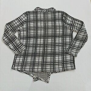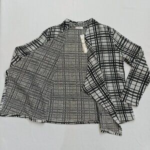 This is a black and white plaid open-front cardigan. The garment features a waterfall front and has a textured knit fabric.
