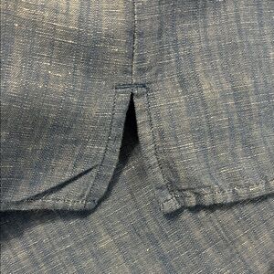Light and comfortable linen blouse with embroidered neckline, tied short sleeves, and side slits. PTP measures 21”. Length is approximately 23”, measures from neckline to bottom hem down the back.