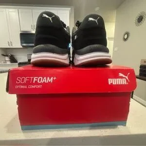 Sleek Puma shoes in black with vibrant orange details. Designed for comfort and style.