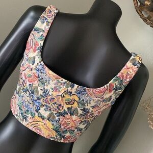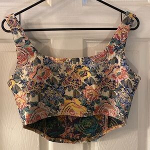Elevate your style with this elegant floral tapestry crop top. Featuring a vibrant mix of colors, this top is perfect for any occasion.