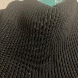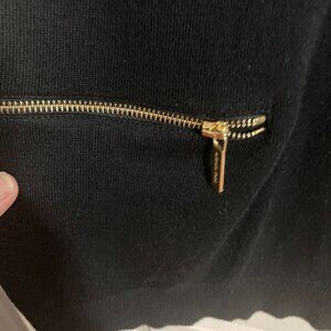 Michael Kors sweater has zipped pockets on either side of the front. The zippers have Michael Kors name engraved in them. It has a ribbed cowl neck and the bottom of the top is ribbed also and has long sleeves.