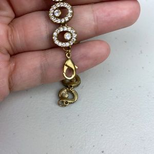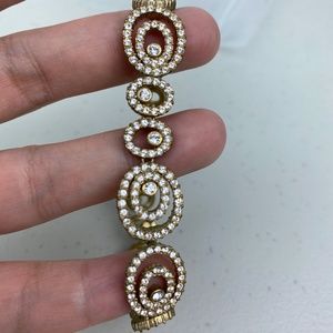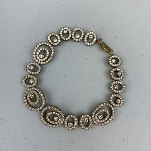Vintage looking/art deco design bracelet. Perfect for a 1920's themed event. Cubic zirconias in a circles pattern. Matte darker gold colored metal. Lays beautifully on the wrist. Lobster clasp. Measures 7.25" long and .5" at its widest. Includes box. Fashion jewelry.