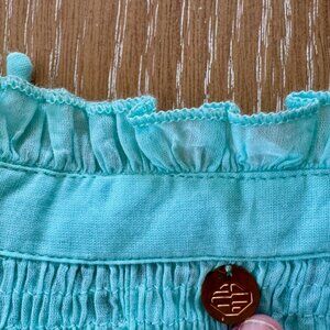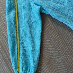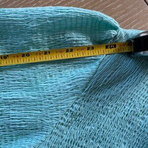 PLEASE NOTE: The color of the main picture is most accurate. It is a light aqua color- NOT BLUE. In some of the pictures, the lighting was weird and the shirt appears to be more baby blue. It is NOT BLUE. Please request more photos if interested.