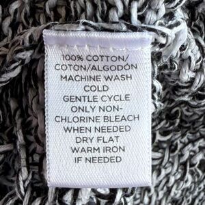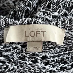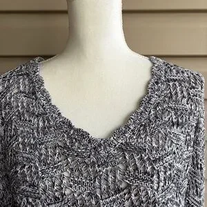 This is a breezy long sleeved open knit pullover sweater from Ann Taylor LOFT, ladies size Large. The knit, 100% cotton, is marked in black and white, creating a neutral gray. Features scalloped edging at the V-neckline, banding at the cuffs and hemline, and split side seams. A beautiful piece to wear over a camisole or tank in warm weather, or over a long sleeved top in cooler weather - super versatile!
