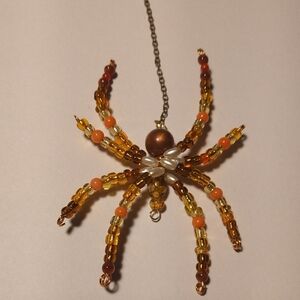 Charming spider pendant with intricate beadwork. Features gold and orange hues. Perfect for adding flair to any outfit.