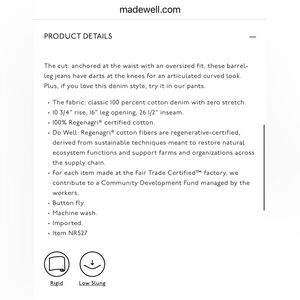 Classic blue jeans. Relaxed slight barrel fit. I absolutely love these jeans but they did not fit. Reposhing to purchase correct size.
