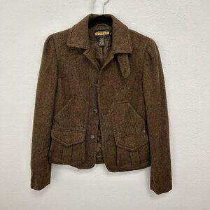 Ralph Lauren Rugby Fitted Tweed Blazer Sz 4 Brown Herringbone Equestrian Celine