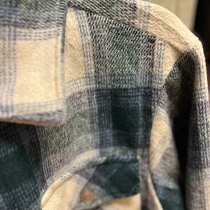 Elevate your casual style with this checkered shirt jacket. Features a teal and beige pattern. Ideal for layering.