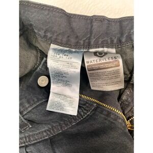 This is a pair of Levi's 80's Balloon Leg Jeans in a retro baggy style, size 26. The jeans are solid black with a charcoal wash, made of 100% cotton denim. They feature a high rise, zip closure, and tapered fit, perfect for a comfortable and relaxed look. Additionally, they have pockets for added functionality. These cropped jeans are a stylish nod to the 80s theme, making them a trendy and versatile addition to any woman's wardrobe.