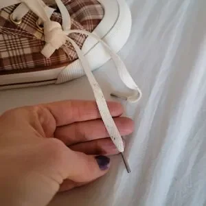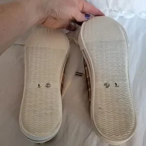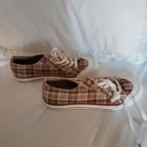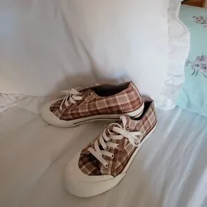 NWOT plaid canvas sneakers featuring white laces. Womens size 9. Small smudge on one of the shoe laces. White rubber bottoms. Brown and white plaid canvas upper. Casual tennis shoes.