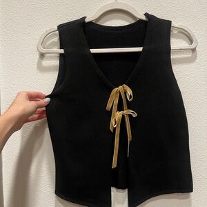 Elegant black sleeveless top featuring stylish gold ribbon accents. Perfect for a chic and modern look.