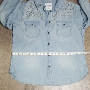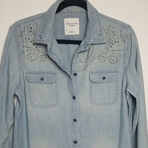 American Eagles Outfitters Womens Casual Chambray Light Denim Shirt w/Studded Accents. Button Down, Tapered Waist, and Long Sleeves w/Button Closures. Perfect for layering.