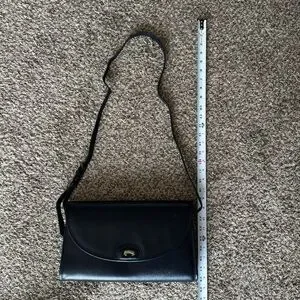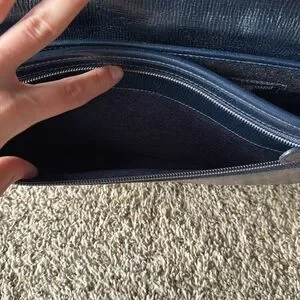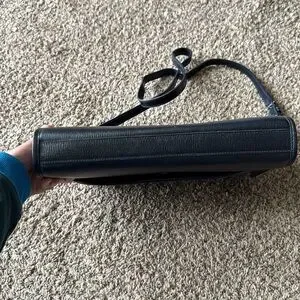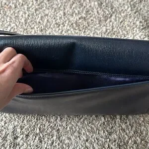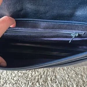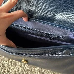 This is in excellent condition overall but the metal on the logo and buckle is tarnishing, which I took a picture of. Other than that, the purse itself is in like new condition! This is a dark navy blue color.