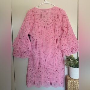 Elegant pink dress with eyelet lace design. Features stylish ruffled details.