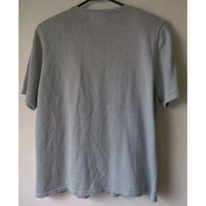 Add a touch of vintage charm to your wardrobe with this beautiful Alfred Dunner cardigan sweater. The light blue color and tight-knit ramie/cotton fabric make it perfect for summer and spring. The sweater features a round neckline, short long sleeves, and shoulder pads for a flattering fit.