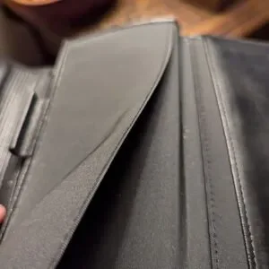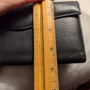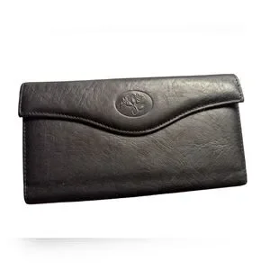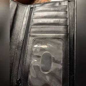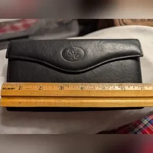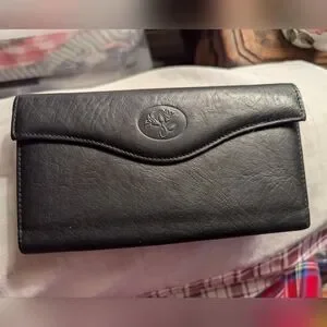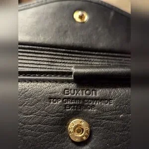 Buxton wallet black top grain leather, floral pattern on front, has a clasp change purse build in, the checkbook can be removed but fits nicely inside the wallet, 5 slots for credit card, and a spot for cash. Zipper enclosure for receipts. Wallet has everything. NWOT. #249
