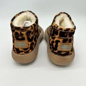 Ultra low cut pull on boot with moulded rubber non slip sole. Padded cow skin printed quilt upper with natural sheepkin lining.