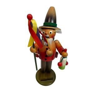 Charming vintage 8.5-inch wooden incense smoker made by Steinbach in West Germany. Depicts a detailed clockmaker with traditional tools and attire, crafted with classic Steinbach quality and hand-painted details. Bottom opens for incense placement, producing smoke through the mouth when lit. Marked “W. Germany.”