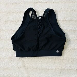 Lightly padded black sports bra with twisted lace back.