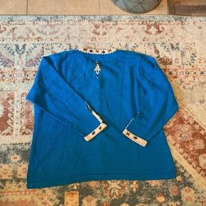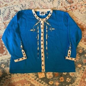 Storybook Knits Ramie & Cotton Blue White Beaded Jeweled Button Down Cardigan 2X. Hidden buttons. Please note small marks near beadwork on front as pictured.