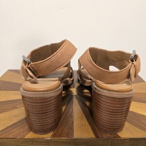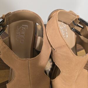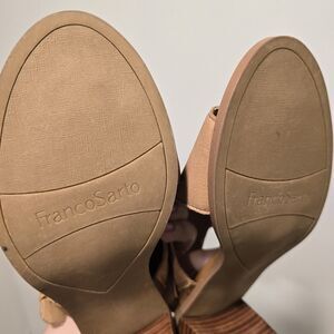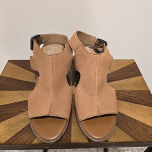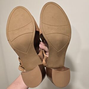 Franco Sarto Leather Heeled Sandals. Slingback buckle closer. Tan brown leather. Block heel. Very comfortable.